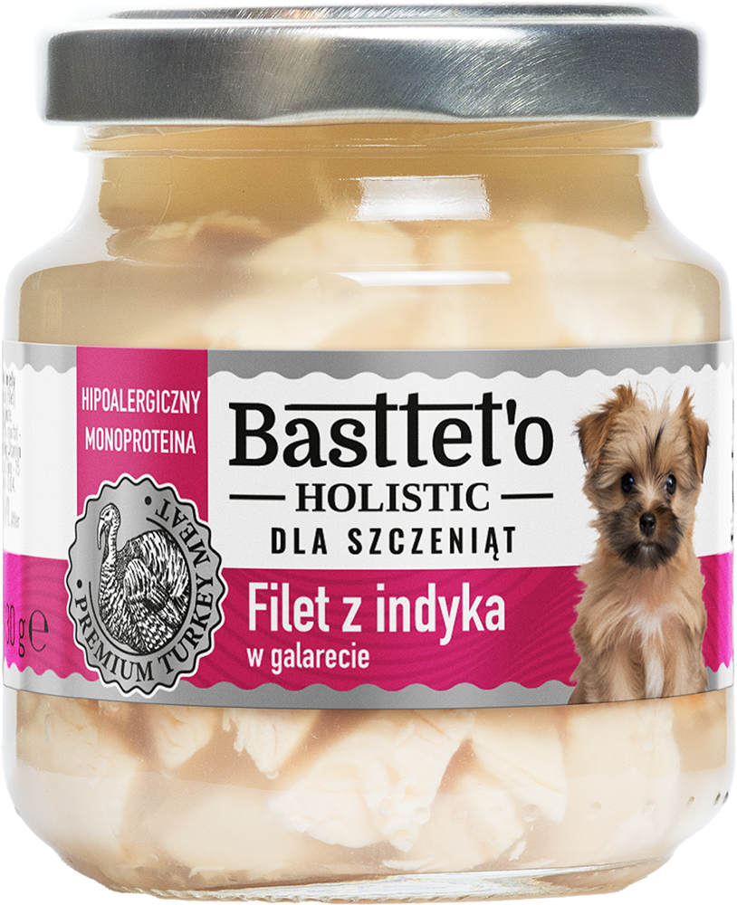Skład: Wyselekcjonowane mięso indyka (filet) 75%, bulion, warzywa (marchew i seler), ananas, fosforan trójwapniowy, witaminy, pierwiastki śladowe.